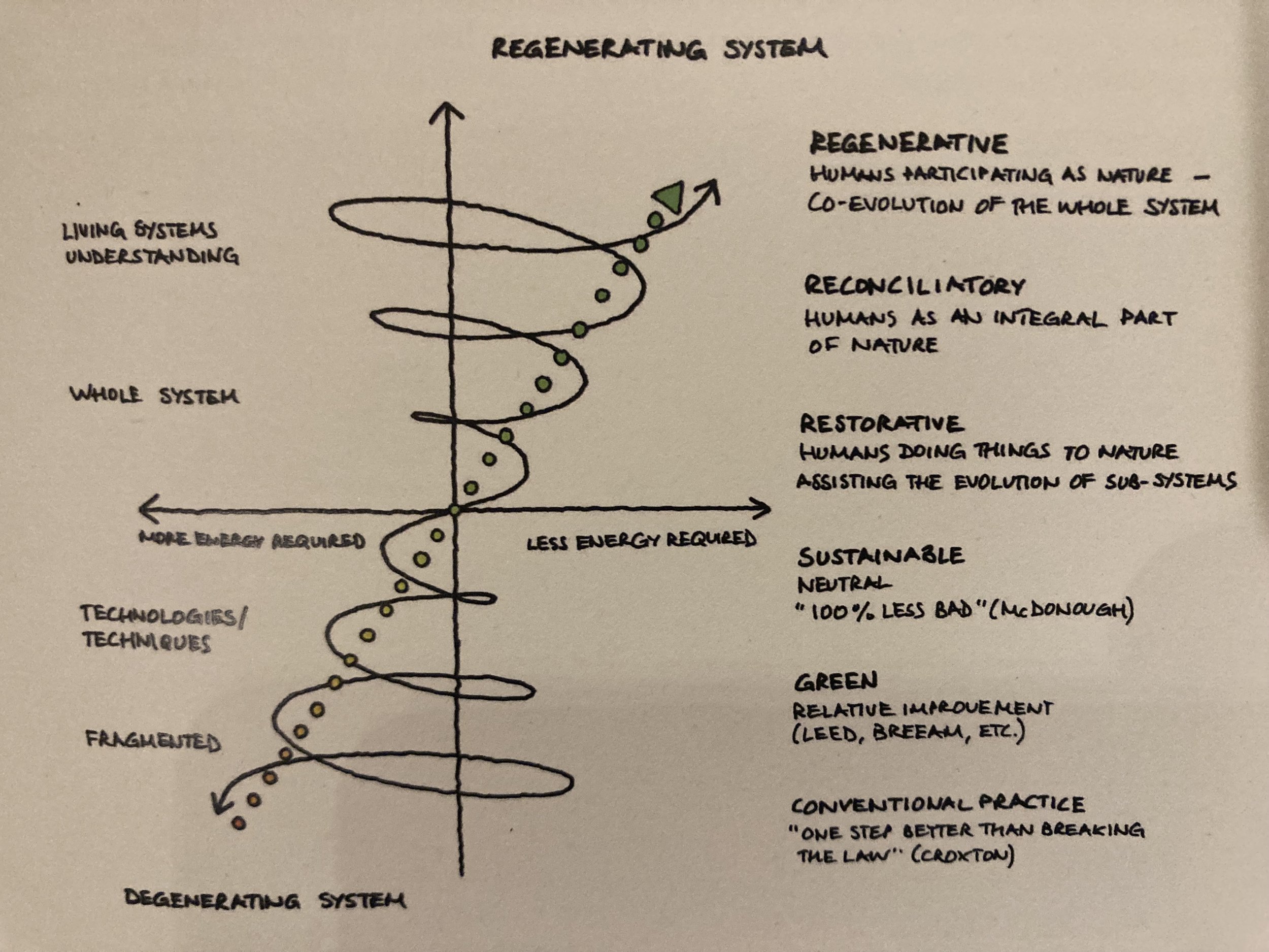 Mcdonough drew attention to the difference between efficiency and effectiveness [ie doing really bad things efficiently is not positive] and created a design mantra that, while seemingly simple, still holds water. Setting a goal to optimise positive impact or in other words to achieve ‘regenerative’ (rather than degenerative or extractive) outcomes was perhaps Mcdonoughs greatest achievement.