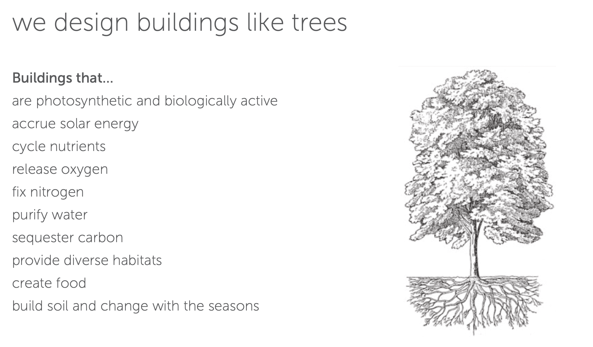In a presentation from November 2025 to the Biomimicry Institute, drawing on philosopher Freya Mathews, Pawlyn shifted the window of discourse further beyond Cradle to Cradle for the first time by asking ”not what nature wants from our by products, but what does nature want in the first place?” [9]